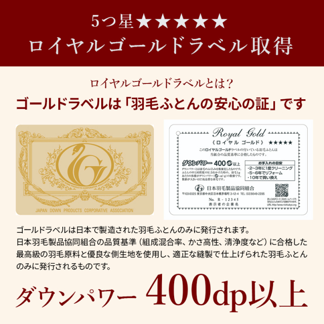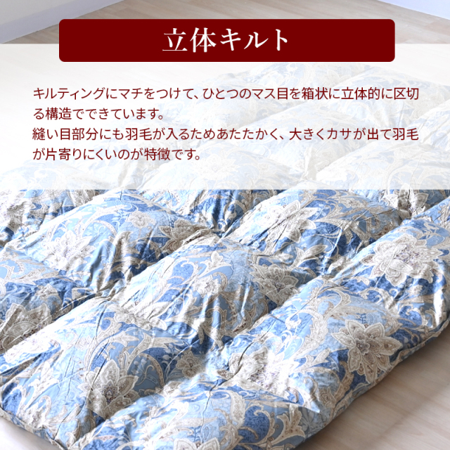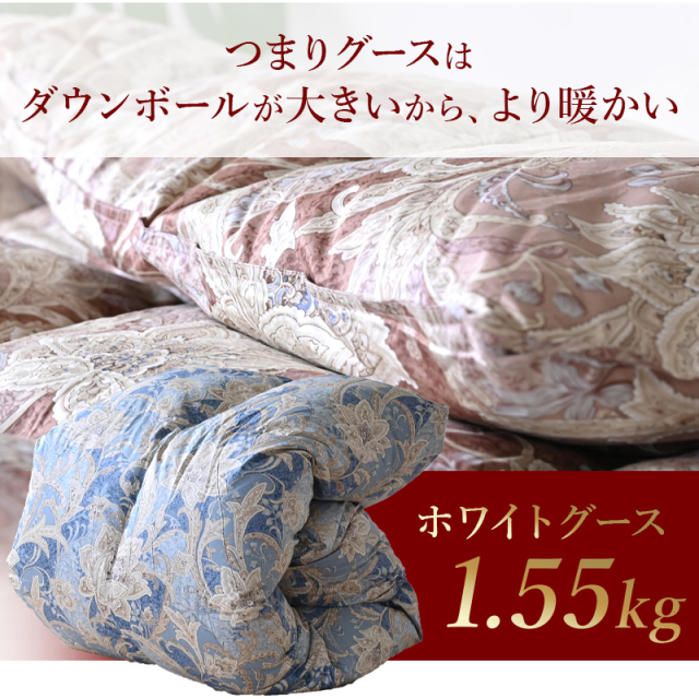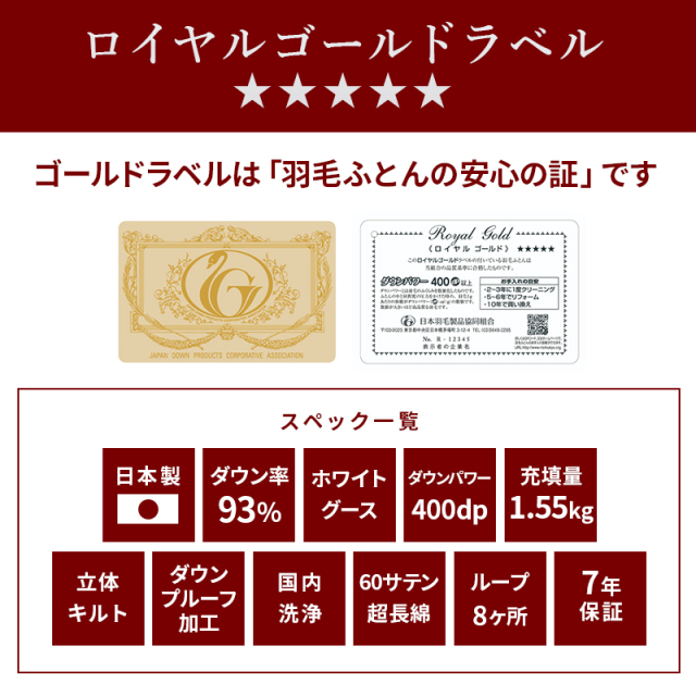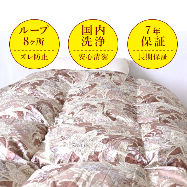 | 詰め物 | ホワイトグースダウン(ダウン93%フェザー7%) ループ8ヶ所 立体キルト 7年保証 ケース付き |