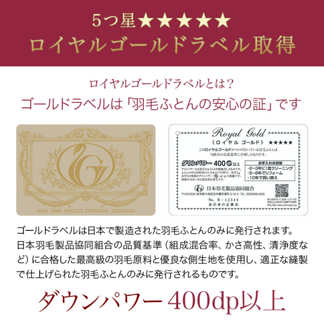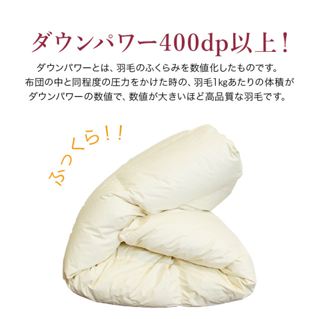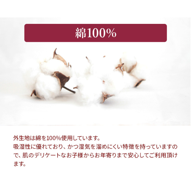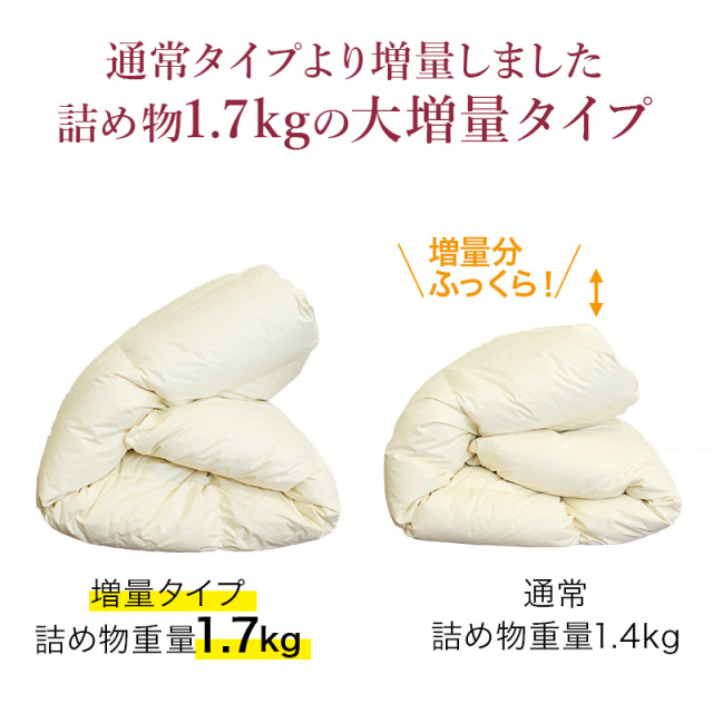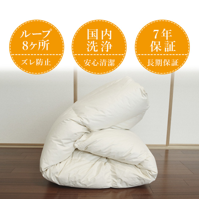 | 詰め物 | ホワイトダックダウン(ダウン93%フェザー7%) ループ8ヶ所 ダウンプルーフ加工 立体キルト 7年保証 |