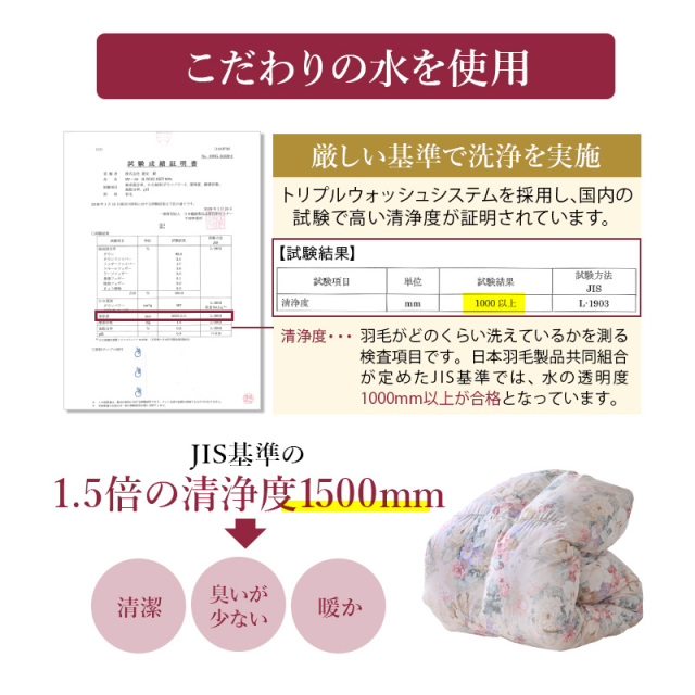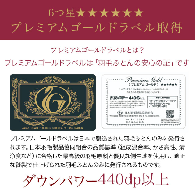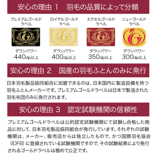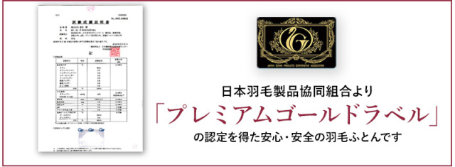 | 詰め物 | ホワイトグースダウン(ダウン95%フェザー5%)プレミアムゴールドラベル ループ8ヶ所 ダウンプルーフ加工 二層キルト ハードケース入り 7年保証 |