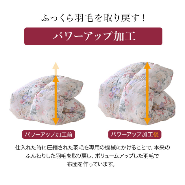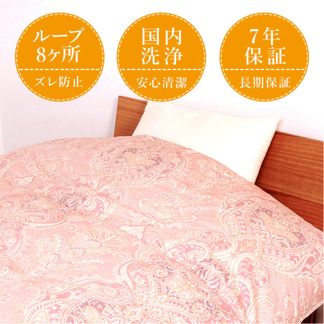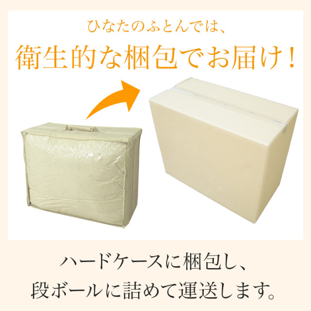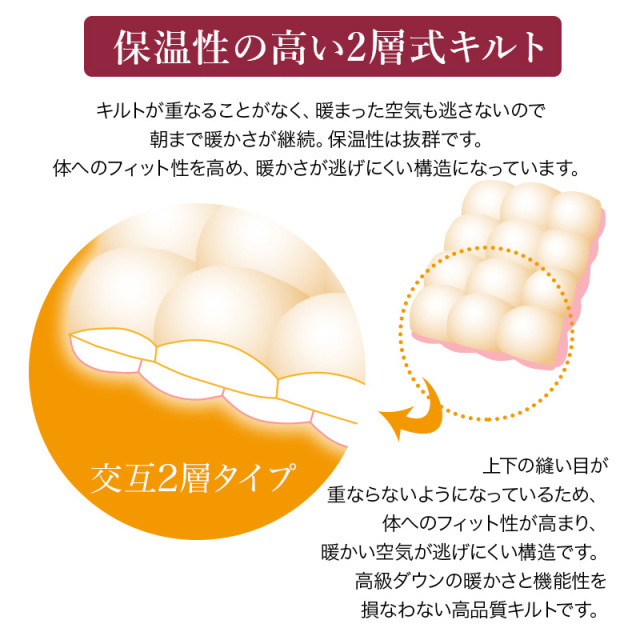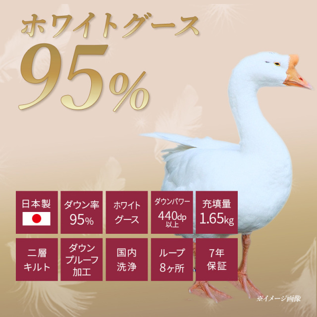 | 詰め物 | ホワイトグースダウン(ダウン95%フェザー5%)プレミアムゴールドラベル ループ8ヶ所 ダウンプルーフ加工 二層キルト ハードケース入り 7年保証 |