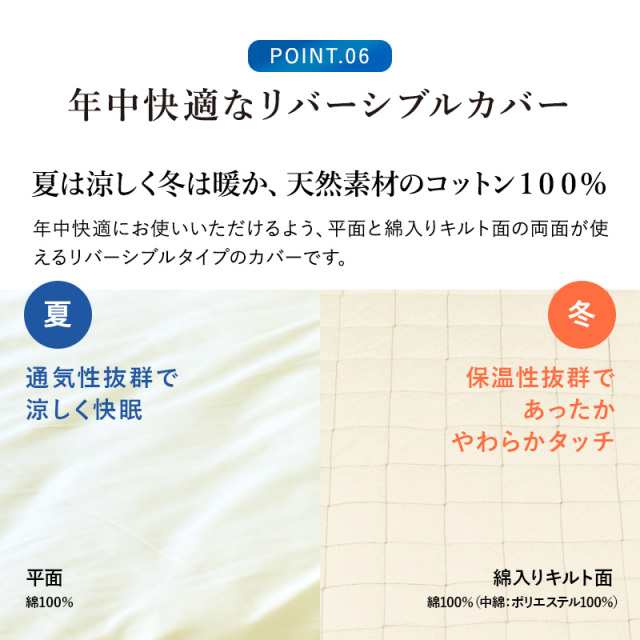 | カバー | 平面:綿100% わた入りキルト面:綿100%(中綿:ポリエステル100%) |