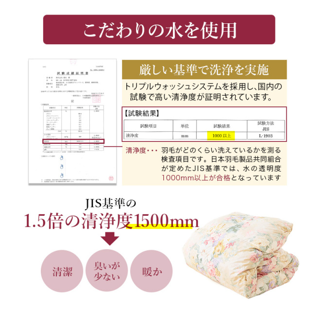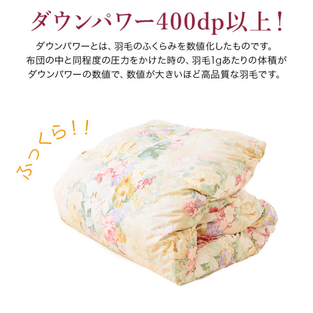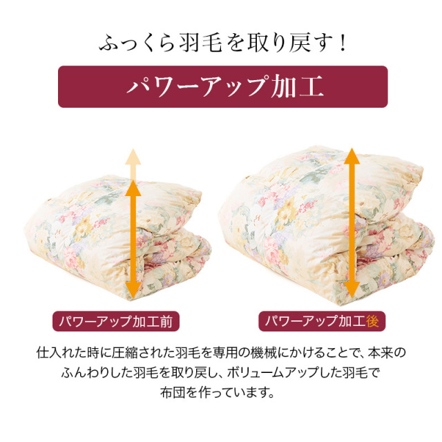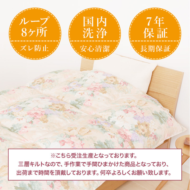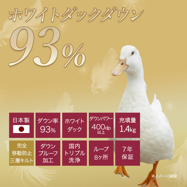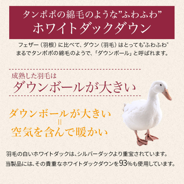 | 詰め物 | ホワイトダックダウン(ダウン93%フェザー7%)ロイヤルゴールドラベル ループ8ヶ所 ダウンプルーフ加工 完全移動防止三層キルト ハードケース付 |