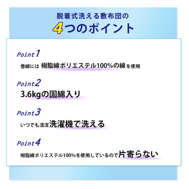 | 注意点 | ファスナー式で中の固綿を取り出せ、外側は2枚に分かれて洗濯機で洗える(洗濯ネットに入れソフト洗い、掛け干し) |