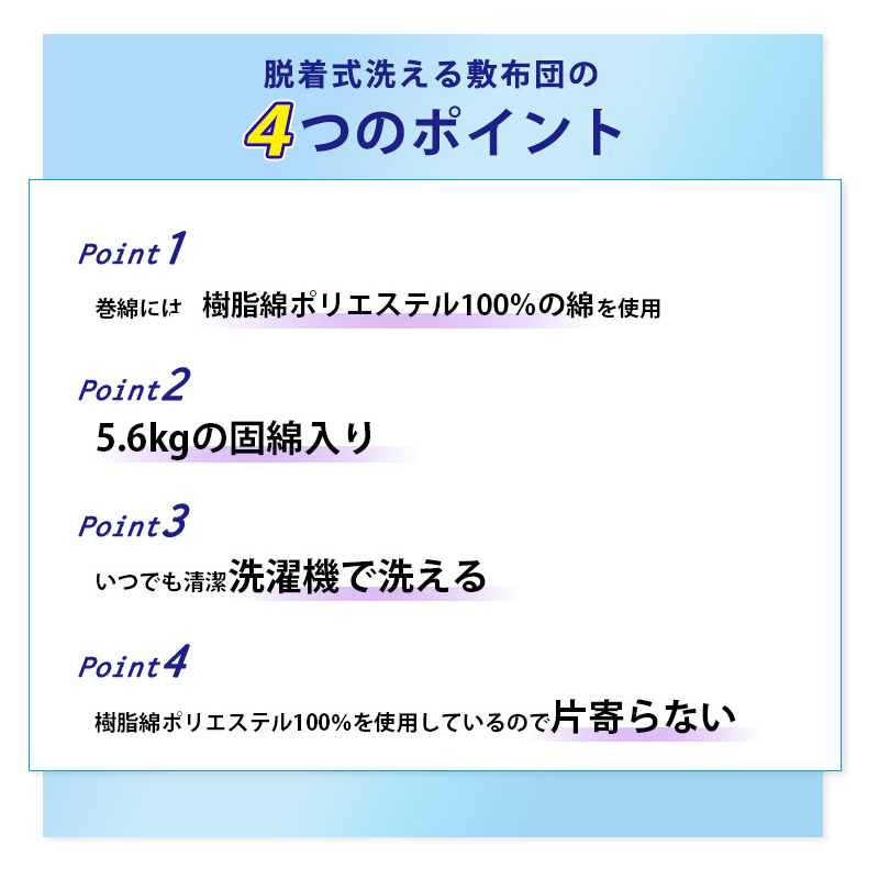 | 注意点 | ファスナー式で中芯を取り出し、外側は2枚に分かれて洗濯機で洗える(洗濯ネットに入れソフト洗い、掛け干し)中材は、シャワー(30度以下の水)等で洗えます。 |