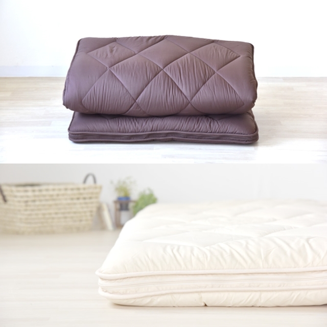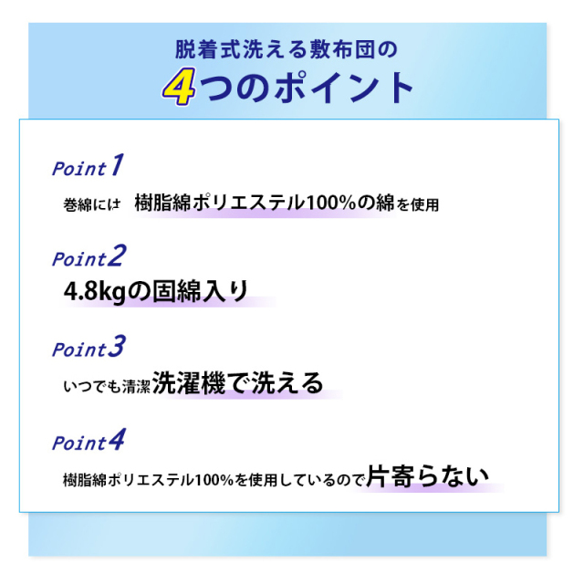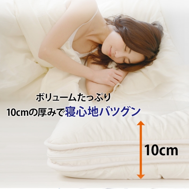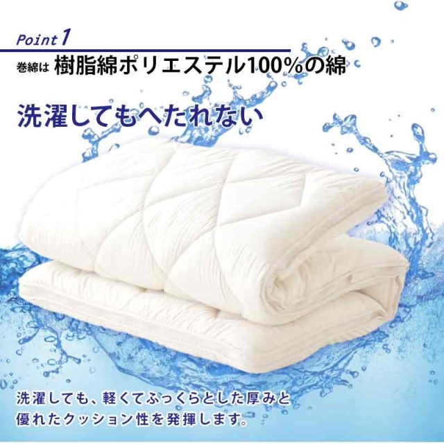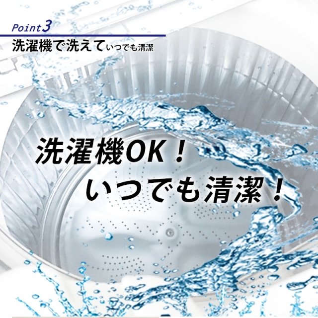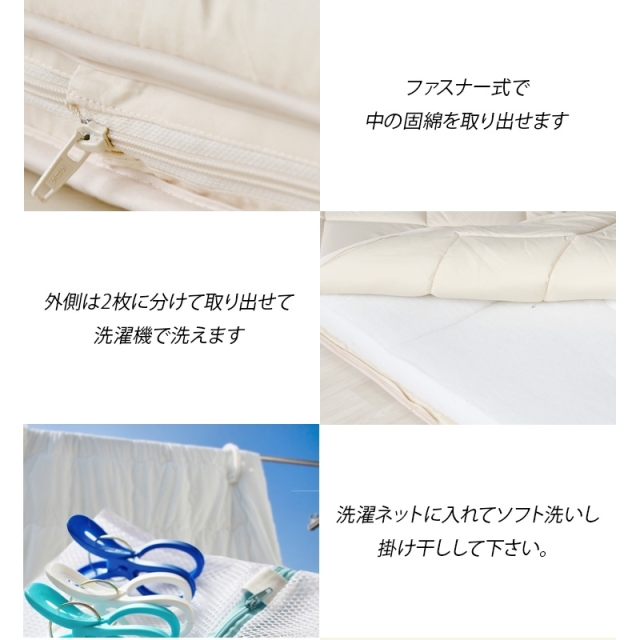 | 注意点 | ファスナー式で中芯を取り出し、外側は2枚に分かれて洗濯機で洗える(洗濯ネットに入れソフト洗い、掛け干し)中材は、シャワー(30度以下の水)等で洗えます。 |