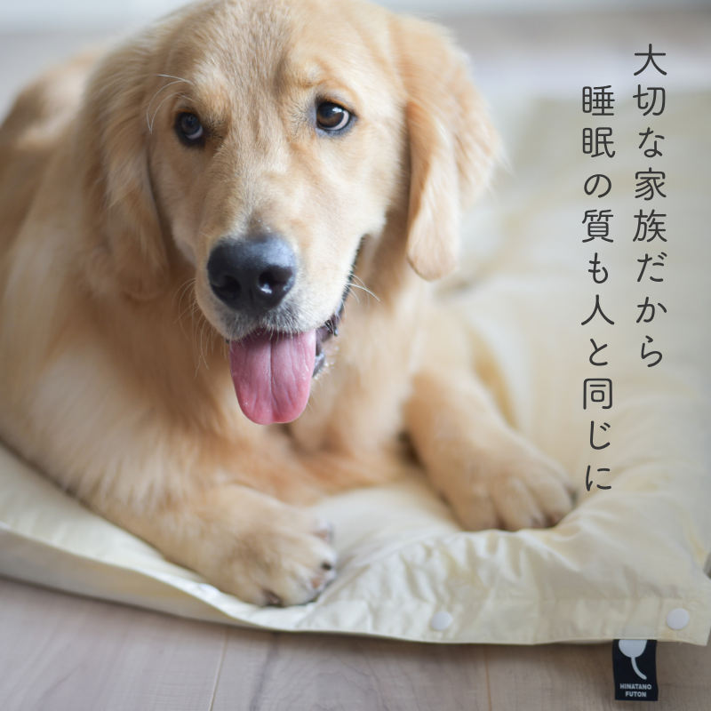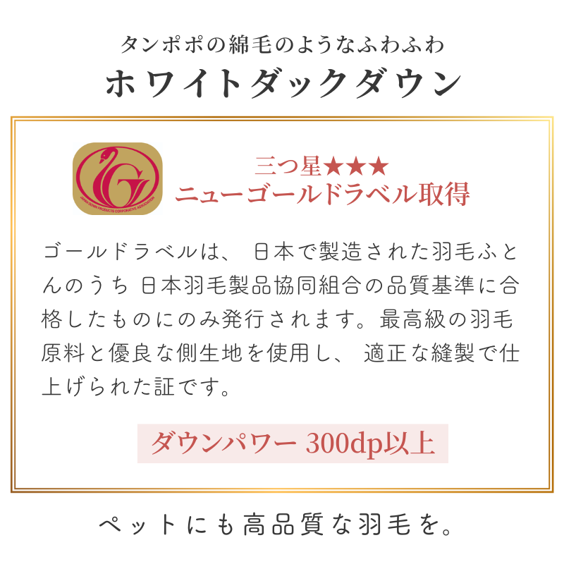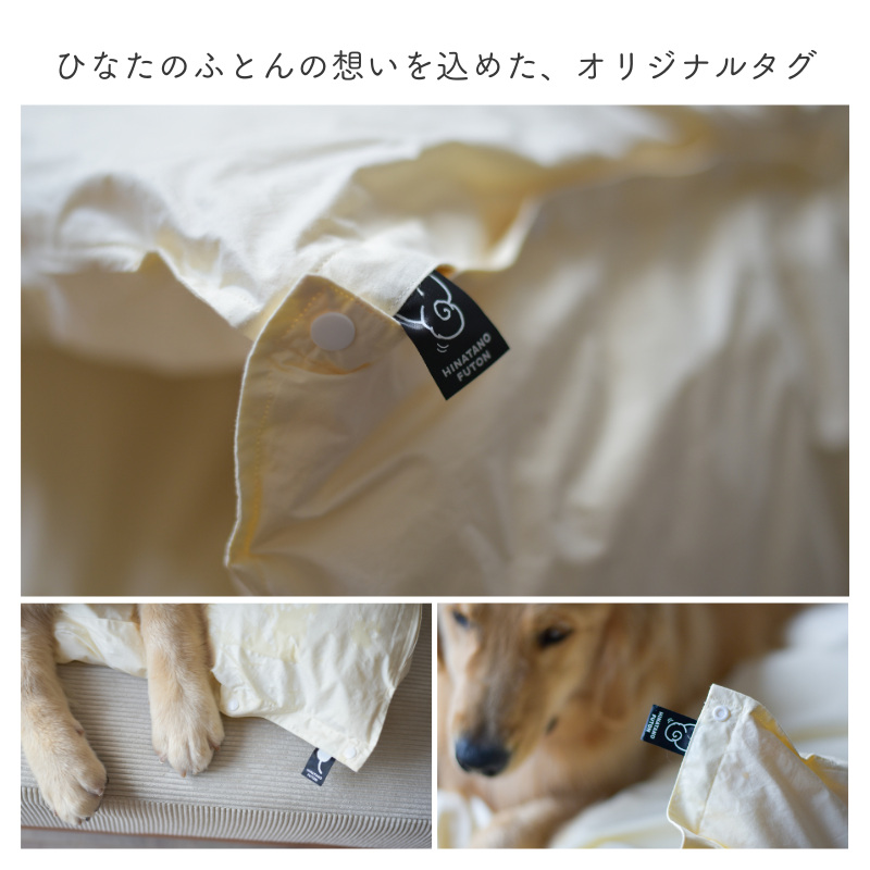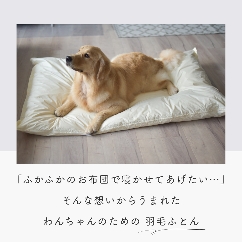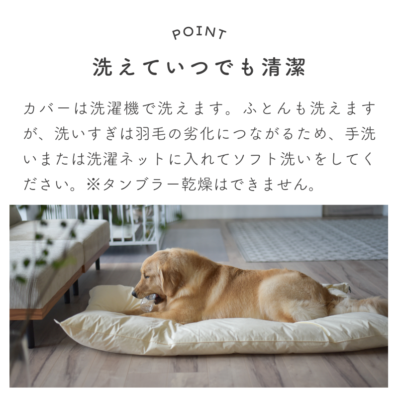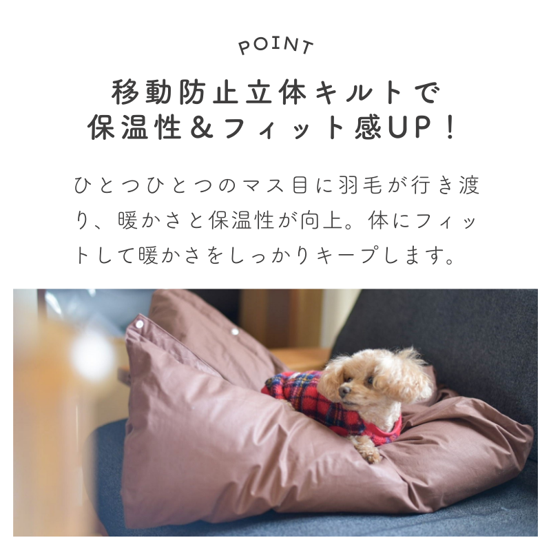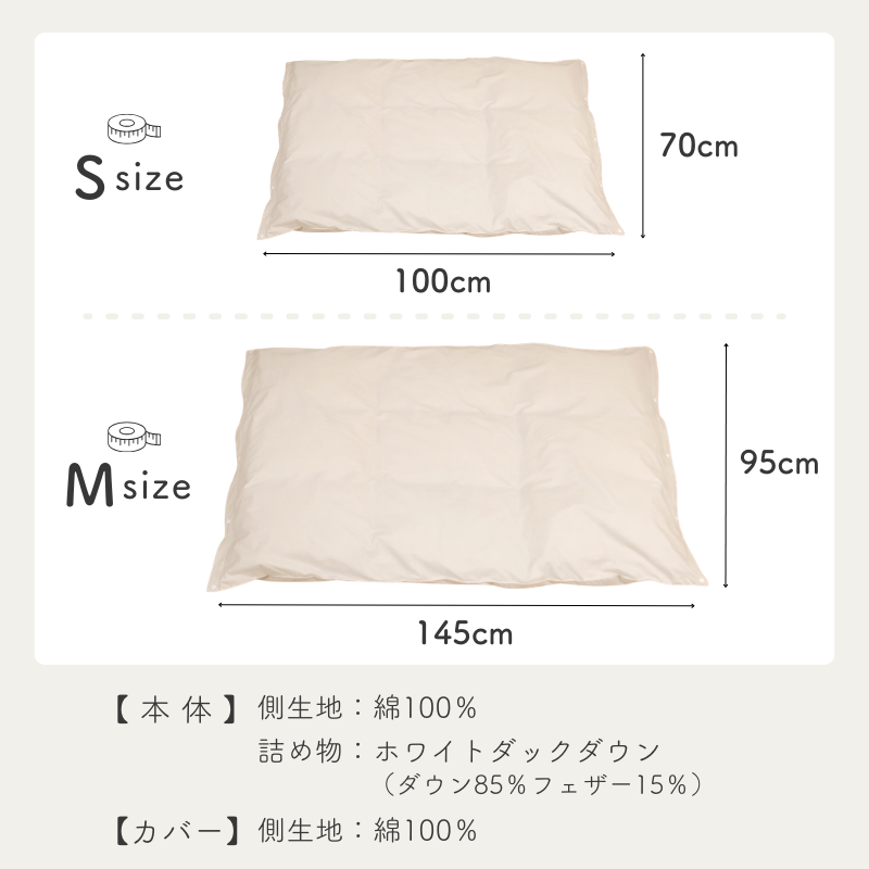 | 本体 | サイズ:S 100×70cm、M 145×95cm 側地:綿100% 詰め物:ホワイトダックダウン(ダウン85%フェザー15%)ニューゴールドラベル 充填量:S 0.3kg、M 0.6kg ループ:4ヶ所 キルト仕様:移動防止立体キルト(洗濯可ですが、粗相した時など特に汚れた時に洗濯をしてください。洗いすぎると中の羽毛の劣化につながります。手洗いか、洗濯ネットに入れてソフトコースで洗い、掛け干ししてください。タンブラー乾燥不可) |