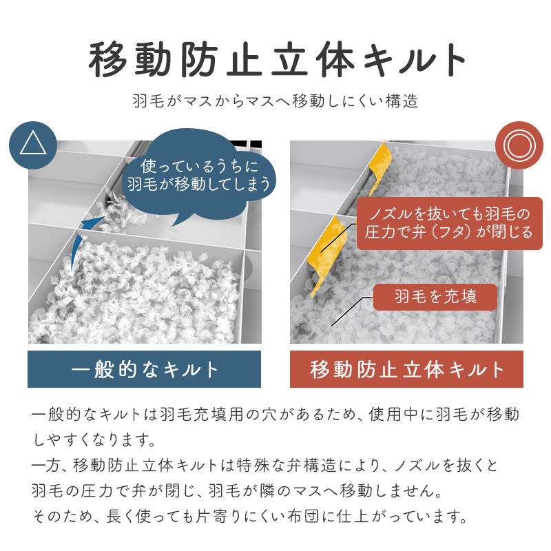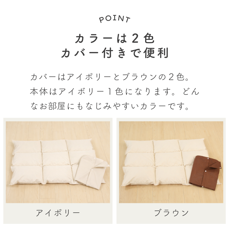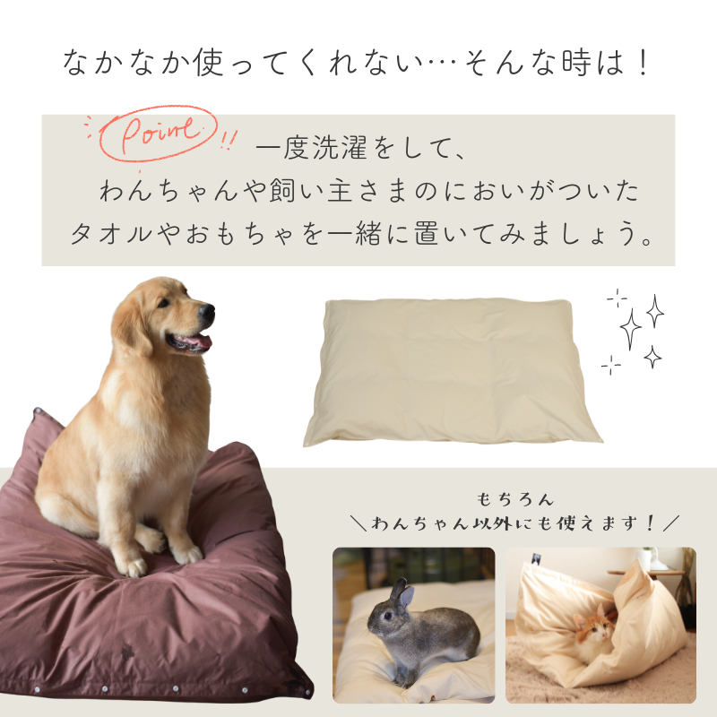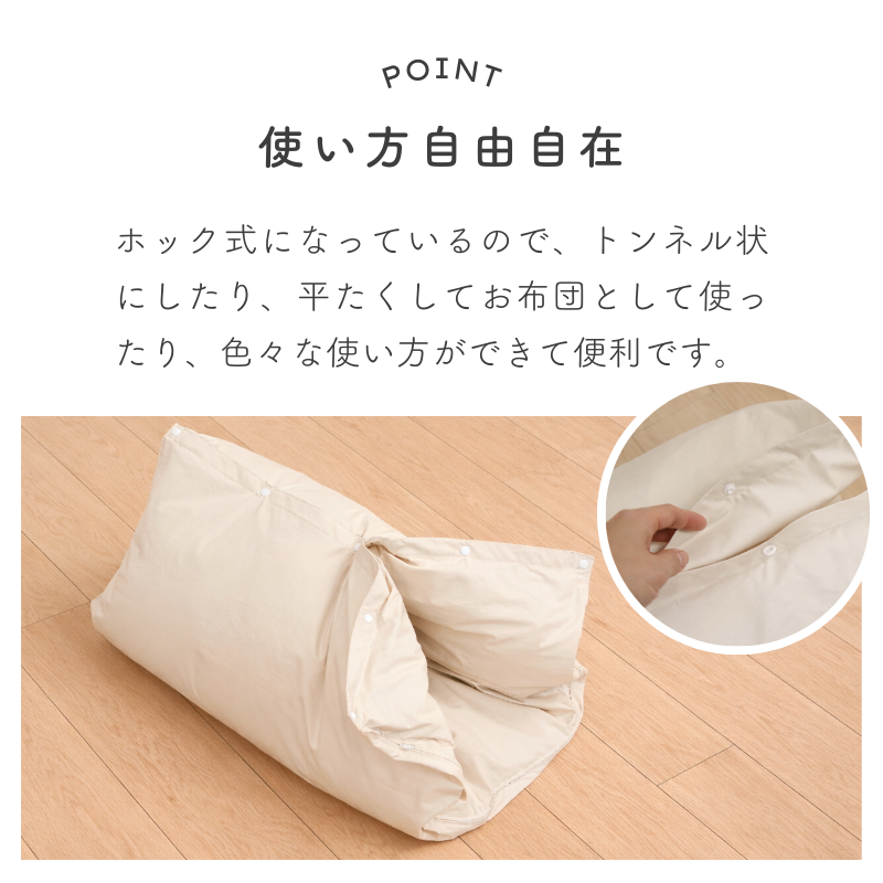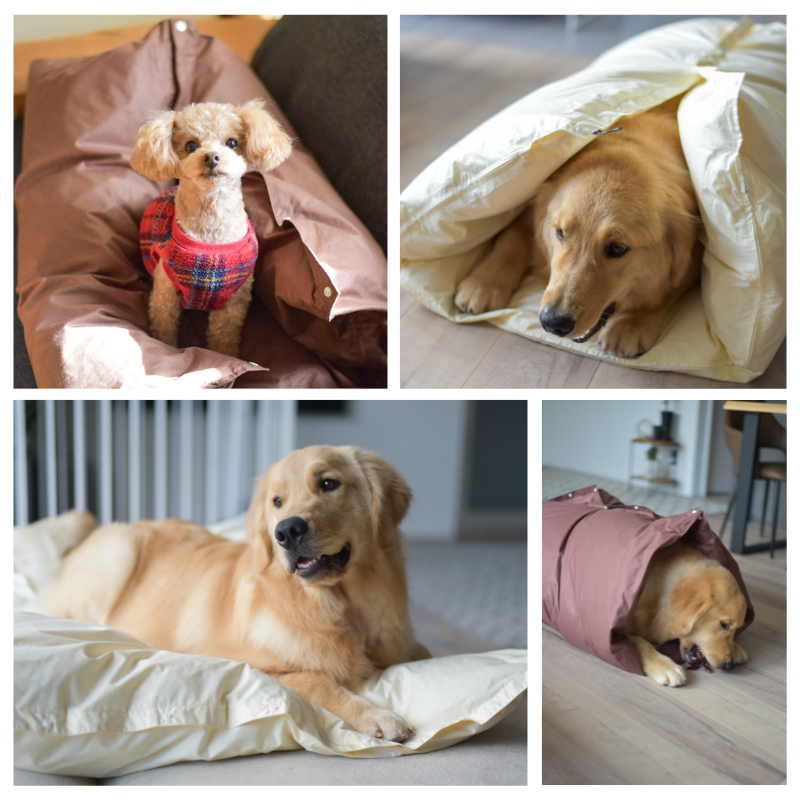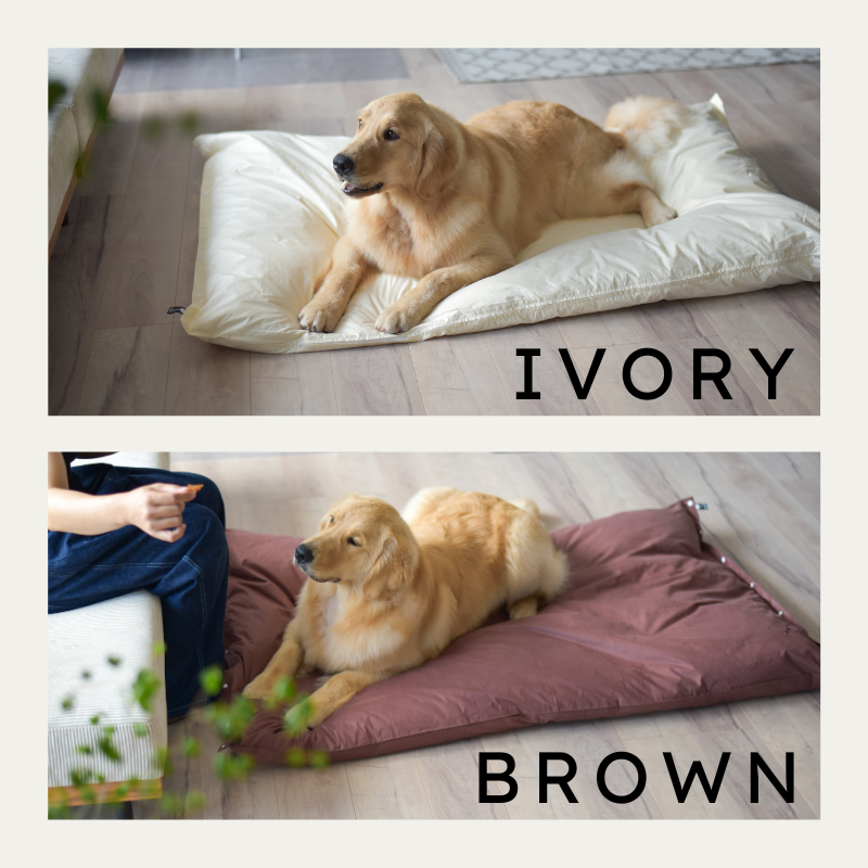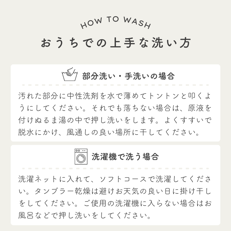 | 本体 | サイズ:S 100×70cm、M 145×95cm 側地:綿100% 詰め物:ホワイトダックダウン(ダウン85%フェザー15%)ニューゴールドラベル 充填量:S 0.3kg、M 0.6kg ループ:4ヶ所 キルト仕様:移動防止立体キルト(洗濯可ですが、粗相した時など特に汚れた時に洗濯をしてください。洗いすぎると中の羽毛の劣化につながります。手洗いか、洗濯ネットに入れてソフトコースで洗い、掛け干ししてください。タンブラー乾燥不可) |
