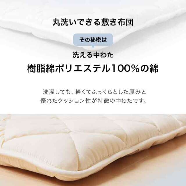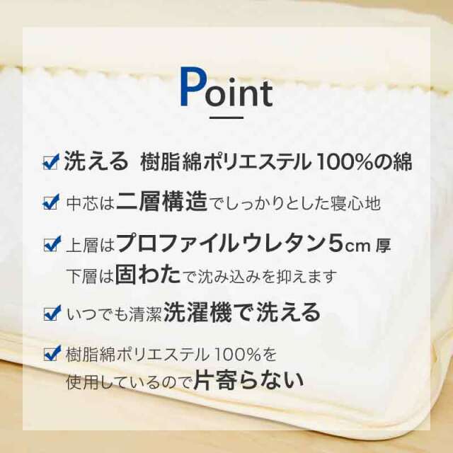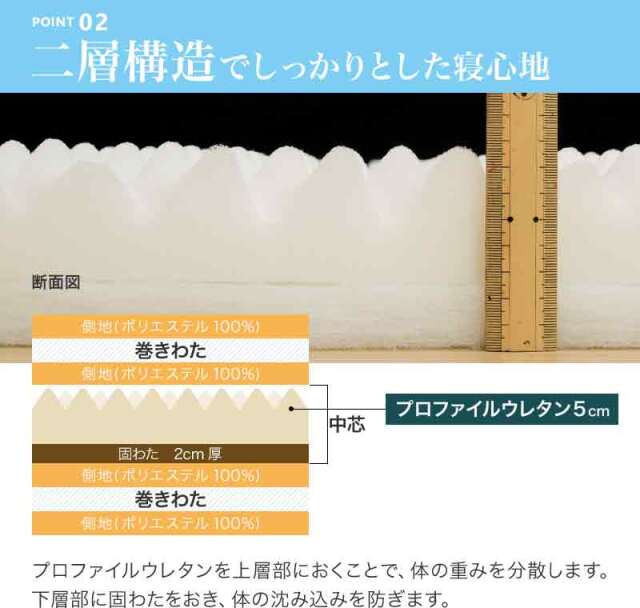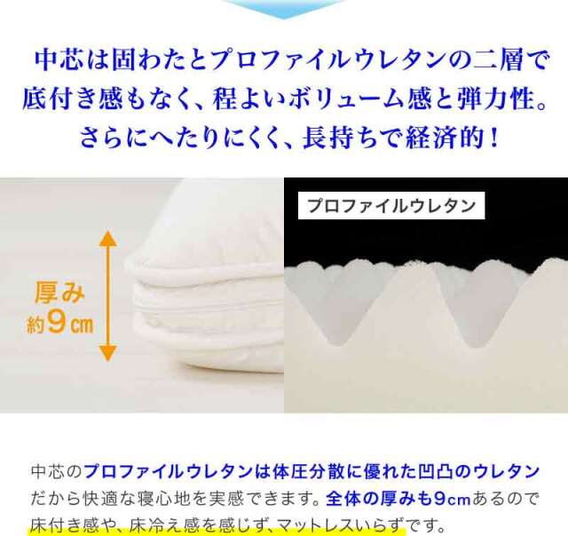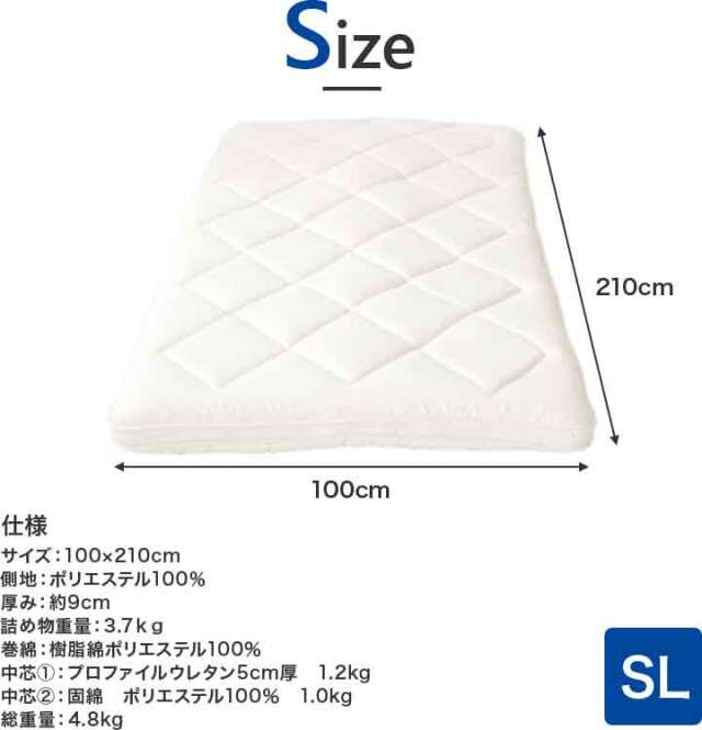 ひなたのふとん HOME 商品一覧 敷布団敷布団シングル マットレスシングル 脱着式洗える敷布団 中芯二層 プロファイルウレタン5cm+固綿 シングル ry0220sl 当店通常価格: ¥9,800(税込) 価格: ¥8,800 (税込) ~ ¥9,800 (税込) [ポイント還元 88ポイント~] 販売期間: 数量: 個 サイズ・カラー当店通常価格価格在庫購入【シングル】アイボリー¥9,800(税込)¥8,800(税込)○ 【シングルロング】アイボリー¥9,800(税込)¥9,800(税込)○ 【シングルロング】ブラウン¥9,800(税込)¥8,800(税込)○ 【シングルロング】グレー¥9,800(税込)¥9,800(税込)○ サイズ・カラー当店通常価格価格在庫購入【シングル】アイボリー¥9,800(税込)¥8,800(税込)○ 【シングルロング】アイボリー¥9,800(税込)¥9,800(税込)○ 【シングルロング】ブラウン¥9,800(税込)¥8,800(税込)○ 【シングルロング】グレー¥9,800(税込)¥9,800(税込)○ 返品についての詳細はこちら 商品説明 サイズ シングル:100×200cm シングルロング:100×210cm 厚み 9cm 側地 ポリエステル100% 詰め物重量 3.7kg 巻綿 ポリエステル100%(樹脂綿) 中芯1:プロファイルウレタン5cm 厚 1.2kg 中芯2:固綿 ポリエステル100% 1.0kg 総重量 4.8kg ※ファスナー式で中芯を取り出せ、外側は2枚に分かれて洗濯機で洗える(洗濯ネットに入れソフト洗い、掛け干し)