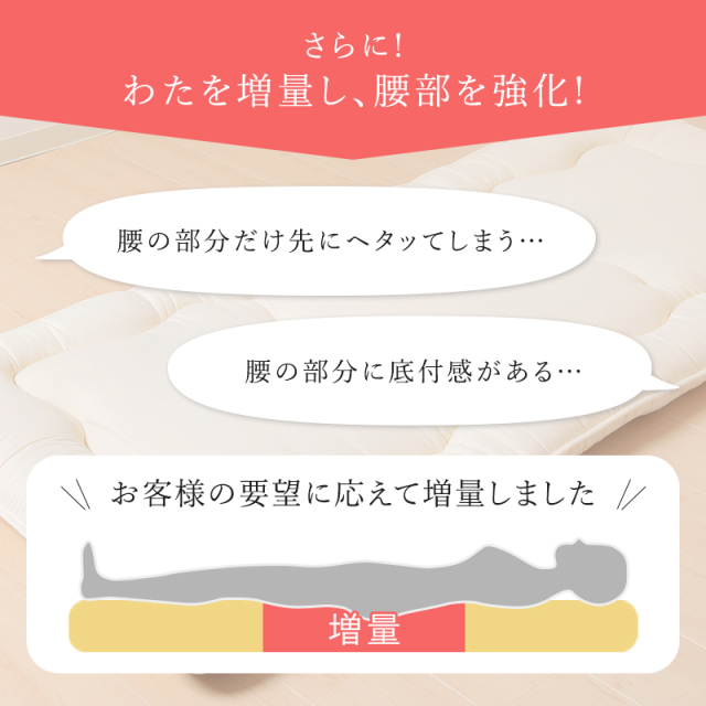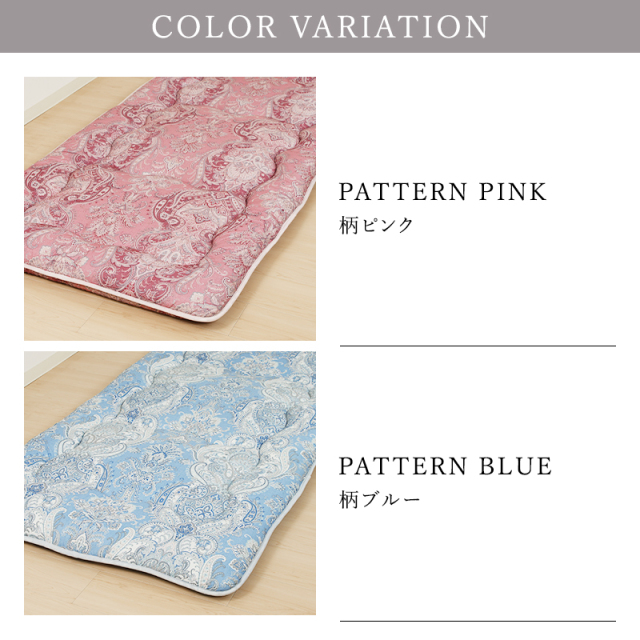 ひなたのふとん HOME 商品一覧 敷布団 敷布団敷布団シングル 敷布団防ダニ敷布団シングル ★□腰がよろこぶ日本製防ダニ・抗菌防臭&バランス敷布団 ry0245S 価格: ¥7,990 (税込) [ポイント還元 79ポイント~] 販売期間: 数量: 個 カラー在庫購入柄ピンク○ 柄ブルー○ 無地アイボリー× 無地ブラウン× 無地グレー× さくら× 無地ブルー× カラー在庫購入柄ピンク○ 柄ブルー○ 無地アイボリー× 無地ブラウン× 無地グレー× さくら× 無地ブルー× 返品についての詳細はこちら 商品説明 サイズ 100×200cm 側地 ポリエステル100% 詰め物重量 2.8㎏(総重量:3.3㎏) 巻ワタ ポリエステル100%(東洋紡フィルハーモニィ)1.8㎏ 固ワタ ポリエステル100%(1.0㎏)※腰の部分にワタを増量して強化