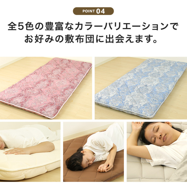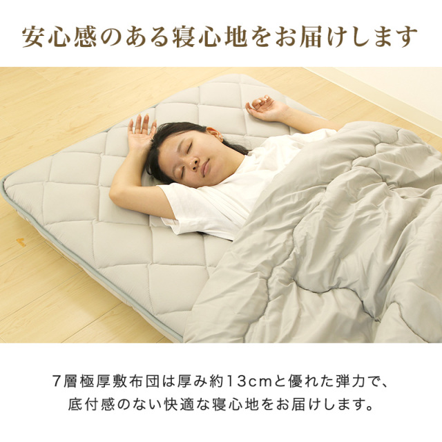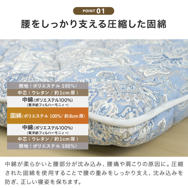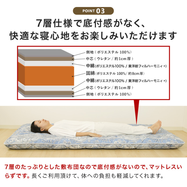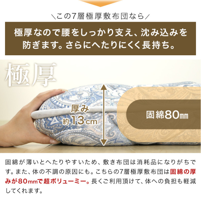 ひなたのふとん HOME 商品一覧 敷布団 敷布団敷布団シングル 敷布団防ダニ敷布団 敷布団防ダニ敷布団シングル 7層極厚敷布団 SL ry0287 価格: ¥12,000 (税込) [ポイント還元 120ポイント~] 販売期間: 数量: 個 カラー在庫購入柄ピンク○ 柄ブルー○ 無地アイボリー○ 無地グレー○ さくら○ 無地ブルー○ カラー在庫購入柄ピンク○ 柄ブルー○ 無地アイボリー○ 無地グレー○ さくら○ 無地ブルー○ 返品についての詳細はこちら 商品説明 サイズ 幅100x長さ210cm(シングルロングサイズ) 厚み 約13~14cm(固綿80mm) 詰め物重量 約5.0kg 総重量 約5.5kg 素材 側地:ポリエステル100% 中芯:ウレタン(約1cm厚) 中綿:ポリエステル100% 約1.5kg(東洋防フィルハーモニィ) 固綿:ポリエステル100% 約3.0kg(約8cm厚) 中芯:ウレタン(約1cm厚) 側地:ポリエステル100% 生産国 日本
