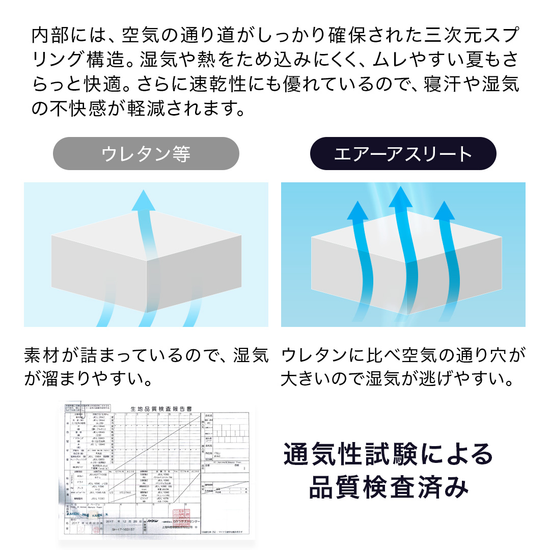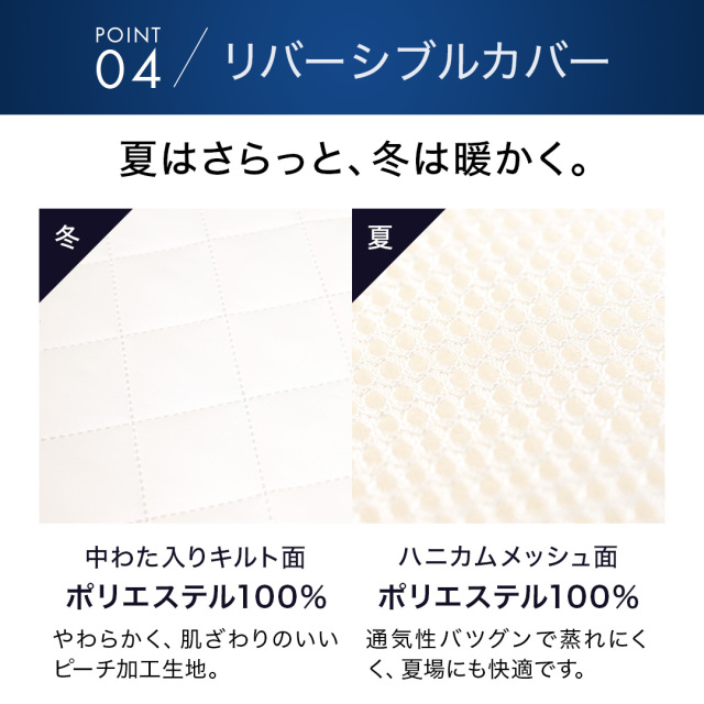 | カバー | ハニカムメッシュ面:ポリエステル100% わた入りキルト面:ポリエステル100%(中綿:ポリエステル100%) |