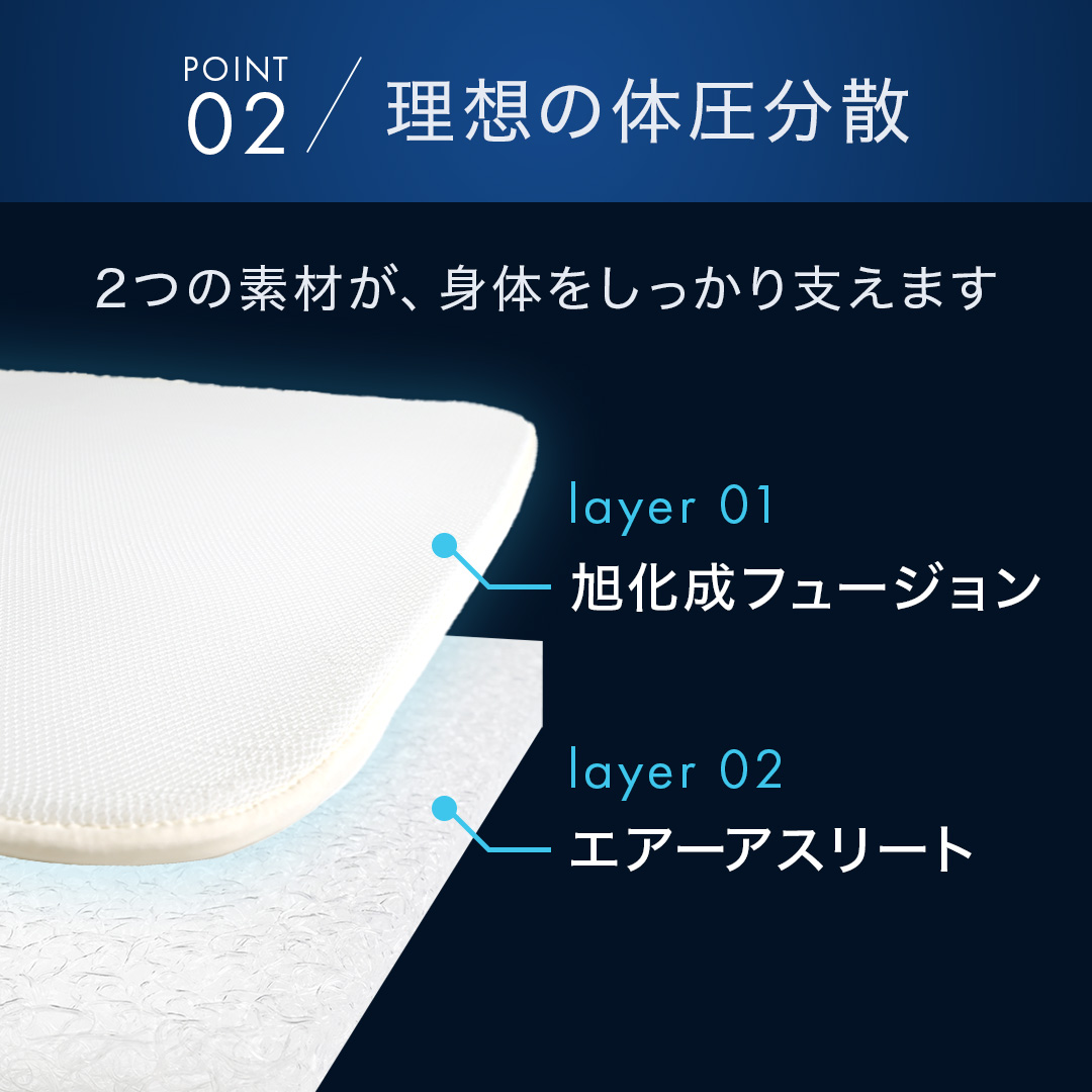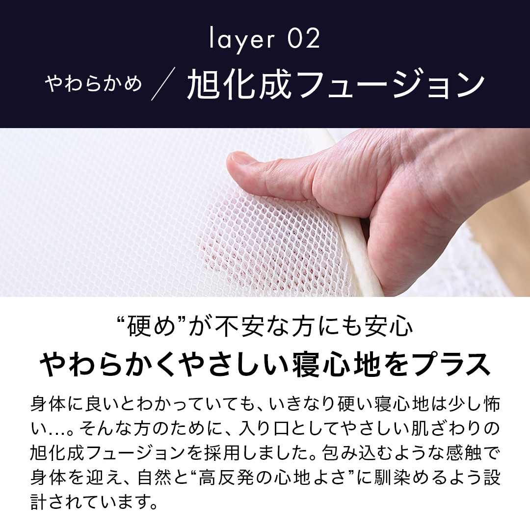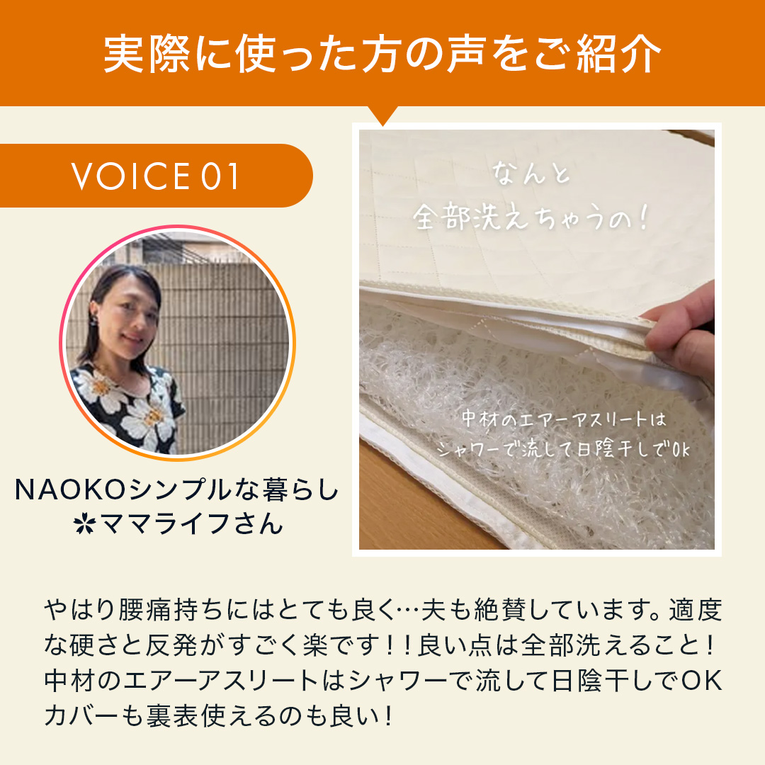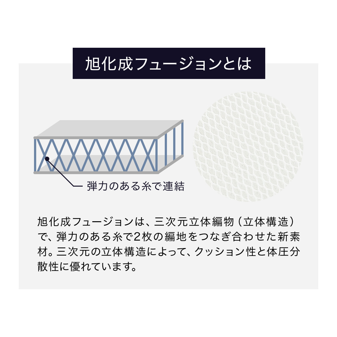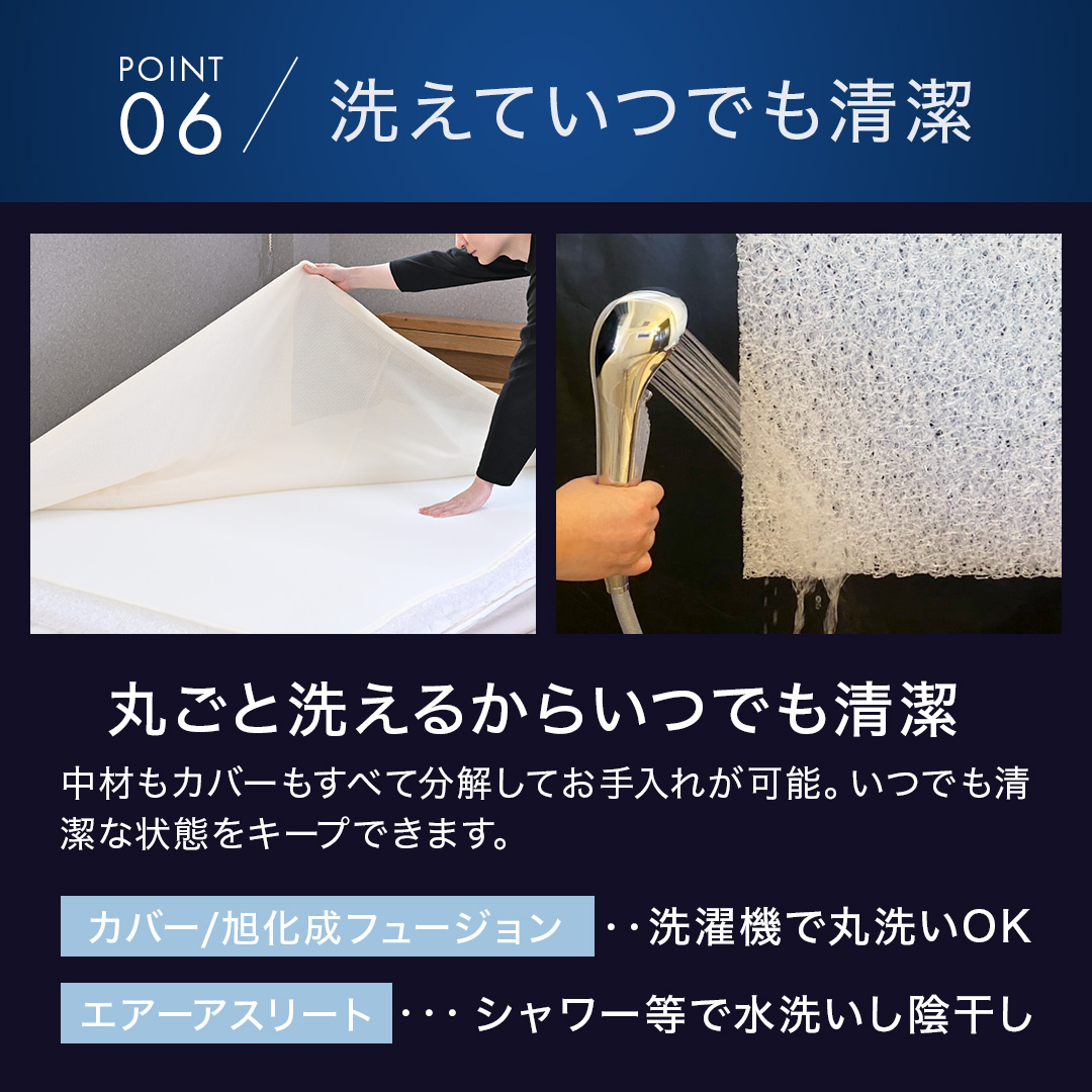 | 注意点 | カバー、旭化成フュージョンは洗濯ネットに入れてソフトコースで。中材はシャワー等で水洗いして陰干し。 |
